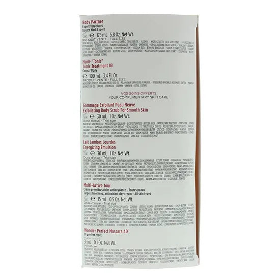 Body Partner Stretch Mark Expert: AQUA/WATER/EAU . CAPRYLIC/CAPRIC TRIGLYCERIDE . ALCOHOL . HYDROGENATED COCO-GLYCERIDES . HYDROGENATED POLYISOBUTENE . CETEARYL ALCOHOL . ISONONYL ISONONANOATE . GLYCERIN . DIMETHICONE . CORYLUS AVELLANA (HAZEL) SEED OIL . SQUALANE . CETEARYL GLUCOSIDE . ASIATICOSIDE . CARBOMER . ETHYLHEXYLGLYCERIN . DISODIUM EDTA . ETHYLENE BRASSYLATE . SODIUM CETEARYL SULFATE . SODIUM LAURYL SULFATE . GLYCYRRHETINIC ACID . BUTYLENE GLYCOL . SODIUM HYDROXIDE . MUSA SAPIENTUM (BANANA) FRUIT EXTRACT . TOCOPHEROL . ACETYL TETRAPEPTIDE-2 . DEXTRAN . [C2706A] Body Treatment Oil - Tonic: CORYLUS AVELLANA (HAZEL) SEED OIL, PELARGONIUM GRAVEOLENS FLOWER OIL, ROSMARINUS OFFICINALIS (ROSEMARY) LEAF OIL, MENTHA ARVENSIS LEAF OIL, LINALOOL, CITRONELLOL, GERANIOL, LIMONENE, CITRAL, [C0756F] Exfoliating Body Scrub for Smooth Skin: AQUA/WATER/EAU, MICROCRYSTALLINE CELLULOSE, GLYCERYL STEARATE SE, BUTYLENE GLYCOL, CAPRYLIC/CAPRIC TRIGLYCERIDE, DIMETHICONE, SODIUM COCO-SULFATE, BAMBUSA ARUNDINACEA STEM EXTRACT, CI 77891/TITANIUM DIOXIDE, CETYL ALCOHOL, POLYGLYCERYL-3 DIISOSTEARATE, PARFUM/FRAGRANCE, COCAMIDE MIPA, GLYCERIN, BUTYROSPERMUM PARKII (SHEA) BUTTER, CITRIC ACID, PHENOXYISOPROPANOL, COCONUT ALCOHOL, BISABOLOL, DISODIUM EDTA, GLYCYRRHETINIC ACID, MENTHOL, SODIUM SULFATE, SODIUM CHLORIDE, MIMOSA TENUIFLORA BARK EXTRACT, PHENOXYETHANOL, CI 15985/YELLOW 6, MORINGA PTERYGOSPERMA SEED EXTRACT, DISODIUM PHOSPHATE, METHYLCHLOROISOTHIAZOLINONE, SORBIC ACID, METHYLISOTHIAZOLINONE, CI 17200/RED 33 [C0942E] Energizing Emulsion: AQUA/WATER/EAU, STEARIC ACID, PARAFFINUM LIQUIDUM/MINERAL OIL/HUILE MINERALE, GLYCERYL STEARATE, CETEARETH-20, POLYSORBATE 60, GLYCERIN, CITRUS LIMON (LEMON) PEEL OIL, LIMONENE, PEG-100 STEARATE, MENTHOL, PROPYLENE GLYCOL DICAPRYLATE/DICAPRATE, PHENOXYETHANOL, BUTYLENE GLYCOL, CARBOMER, CITRUS AURANTIUM AMARA (BITTER ORANGE) LEAF/TWIG OIL, LINALOOL, ETHYLHEXYLGLYCERIN, SODIUM HYDROXIDE, PRUNUS AMYGDALUS DULCIS (SWEET ALMOND) OIL, SORBIC ACID, TOCOPHERYL ACETATE, CITRAL, ARNICA MONTANA FLOWER EXTRACT, HYPERICUM PERFORATUM EXTRACT, ROSMARINUS OFFICINALIS (ROSEMARY) LEAF OIL, TRITICUM VULGARE (WHEAT) GERM OIL, MENTHA ARVENSIS LEAF OIL, SALVIA SCLAREA (CLARY) OIL, AESCULUS HIPPOCASTANUM (HORSE CHESTNUT) SEED EXTRACT, HAMAMELIS VIRGINIANA (WITCH HAZEL) LEAF EXTRACT, PELARGONIUM GRAVEOLENS FLOWER OIL, GERANIOL, OCIMUM BASILICUM (BASIL) OIL, CITRONELLOL, PARFUM/FRAGRANCE, CUPRESSUS SEMPERVIRENS CONE EXTRACT, EUGENOL, ANTHEMIS NOBILIS FLOWER OIL, CI 42090/BLUE 1, [C0864Q] Multi-Active Day Targets Fine Lines Antioxidant Day Cream: AQUA/WATER, COCO CAPRYLATE/CAPRATE, GLYCERIN, CETEARYL ETHYLHEXANOATE, CETEARYL ALCOHOL, BUTYLENE GLYCOL, BUTYROSPERMUM PARKII SHEA BUTTER, DIMETHICONE, GLYCERYL GLUCOSIDE, PHENOXYETHANOL, METHYL METHACRYLATE CROSSPOLYMER, PARFUM/FRAGRANCE, DIOSACUS SYLVESTRIS EXTRACT, CI77891/TITANIUM DIOXIDE, SYNTHETIC FLUORPHLOGOPITR, CAPRYLYL GLYCOL, ETHYLHEXYLGLYCERIN, TOCOPHERYL ACETATE, CELLULOSE, DISODIUM EDTA, SODIUM HYALURONATE, DIMETHICONOL, DIOSPYROS MESPILISFORMIS LEAF EXTRACT, MALTODEXTRIN, TOCOPHEROL, SANICULA EUROPAEA EXTRACT, TETRASODIUM EDTA, MYROTHAMNUS FLABELLIFOLIA EXTRACT, CITRIC ACID, , LAPSANA COMMUNIS FLOWER/LEAF/STEM EXTRACT, GURCELLARIA LUMBRICALIS EXTRACT, SODIUM CITRATE, POTASSIUM SORBATE, ASCORBIC ACID, GLYCOLIC ACID, LACTIC ACID, MARIS SAL/SEA SALT/SEL MARIN, CI14700/RED 4, CI17200/RED33, POLYVINYL ALCOHOL, COPPER PALMITOYL HEPTAPEPTIDE 14, HEPTAPEPTIDE 15 PALMITATE (V2799A) Wonder Perfect Mascara 4D - # 01 Perfect Black: ISODODECANE. AQUA/WATER/EAU. CI 77499/IRON OXIDES. CERA ALBA/BEESWAX/CIRE D´ABEILLE. TRIMETHYLSILOXYSILICATE. DISTEARDIMONIUM HECTORITE. POLYGLYCERYL-3 BEESWAX. ACRYLATES COPOLYMER. POLYETHYLENE. SILICA. NYMPHAEA CAERULEA FLOWER EXTRACT. PHENOXYETHANOL. PANTHENOL. SPHINGANINE. SODIUM DEHYDROACETATE. ETHYLHEXYLGLYCERIN. LAURETH-21 [STM3672A/02]