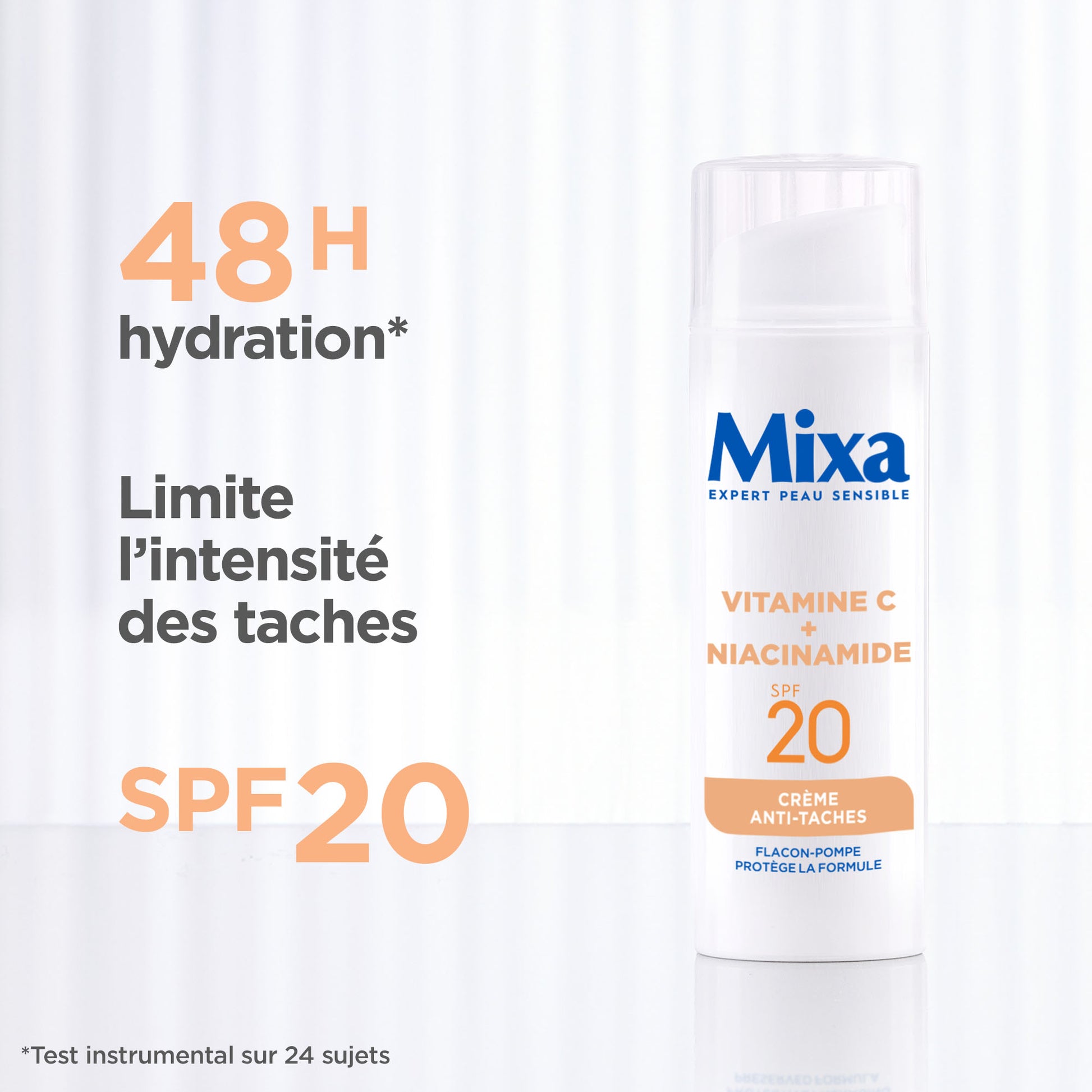 Crème Anti-taches Mixa, pour les teints ternes et irréguliers, au duo d’actifs complémentaires : la Vitamine Cg et la Niacinamide.