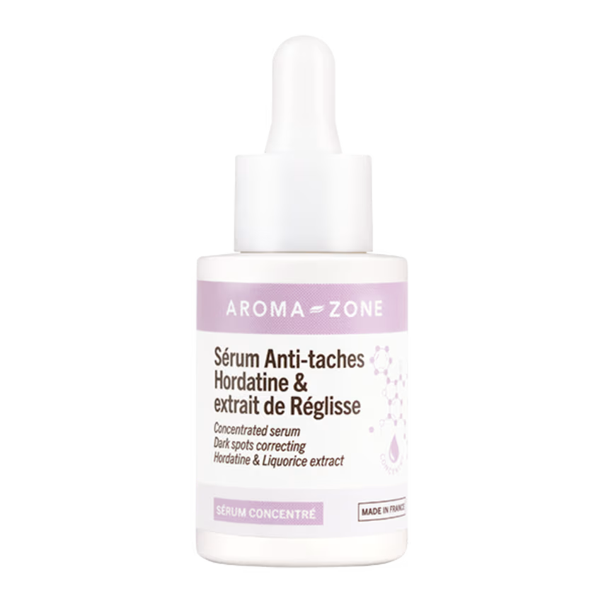 - Ingrédients clés: Innovation Aroma-Zone, sa formule combine une nouvelle génération d'actifs anti-taches, anti-âge et éclaircissant grâce à un complexe 100% d'origine naturelle d'hordatine, d'extrait d'algue arc-en-ciel et d'extrait de réglisse qui agissent sur les taches pigmentaires . Ce complexe est optimisé par 5% de Niacinamide.
