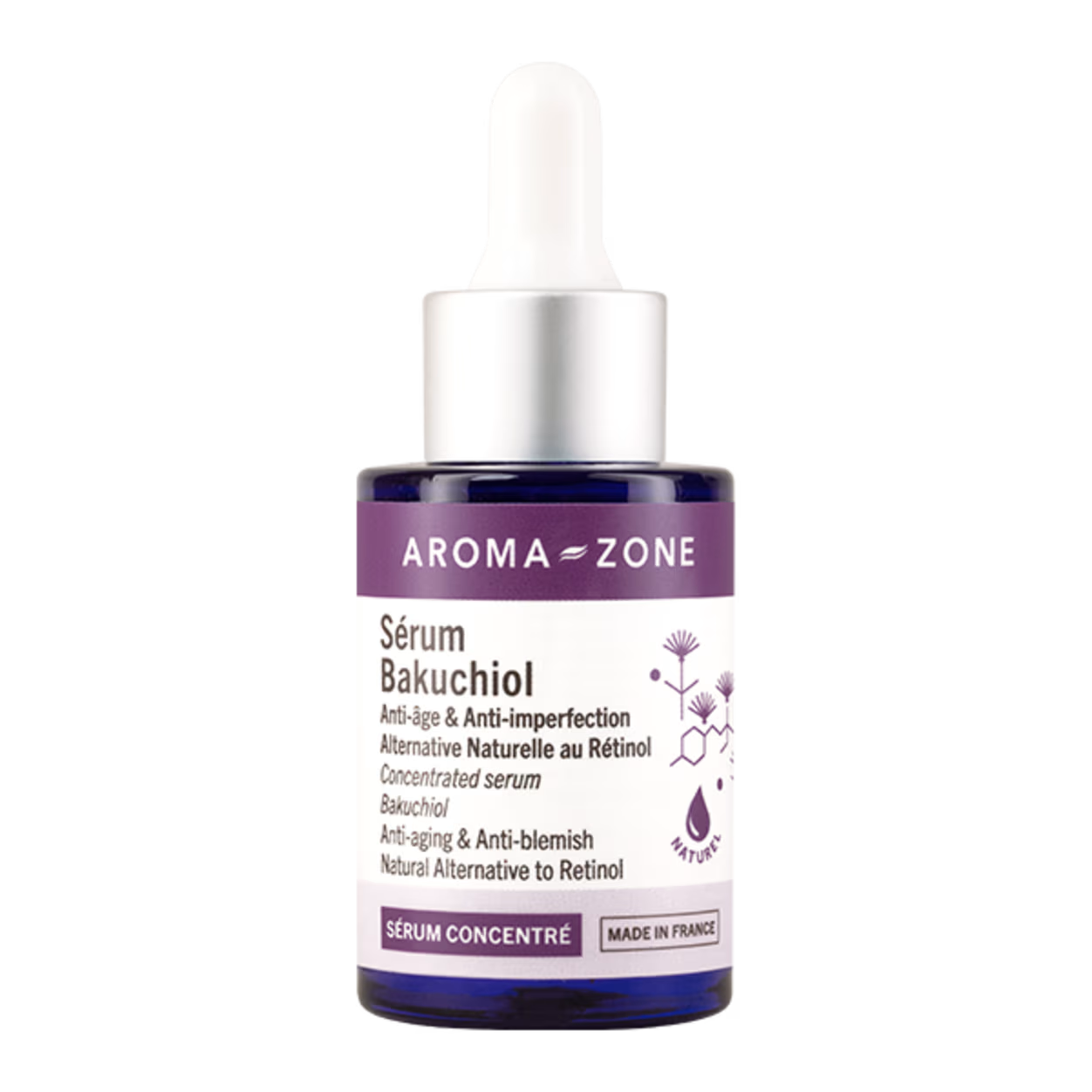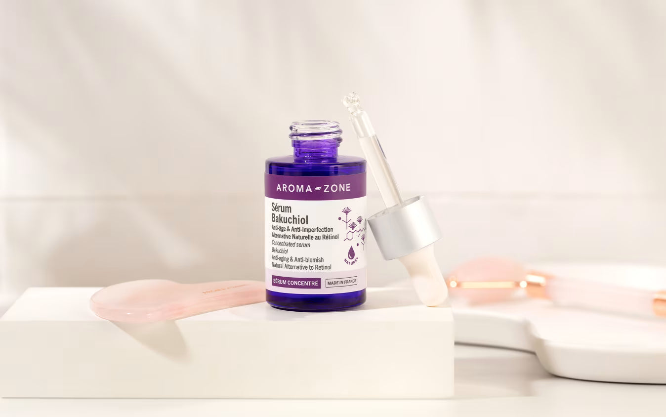À la fois anti-âge et anti-imperfections, notre sérum visage naturel bénéficie d'une forte concentration en Bakuchiol, un actif révolutionnaire reconnu comme l’alternative végétale au rétinol, efficace et non photosensibilisante. Antioxydant, régénérant et booster de collagène, cet actif naturel extrait des graines de Babchi aide à maintenir la fermeté de la peau, lisse les ridules et atténue les taches brunes. Il améliore également l'état des peaux à tendance acnéique qu'il régule, répare et purifie sans les agresser. Formulé sur base de squalane d’Olive, notre sérum concentré Bakuchiol pénètre facilement sans laisser de film gras. Très puissant et hautement concentré en actif, nous recommandons d’appliquer ce soin en pli du coude au moins 48 heures avant de l’utiliser sur le visage afin de vérifier qu’il est parfaitement adapté à votre peau.
